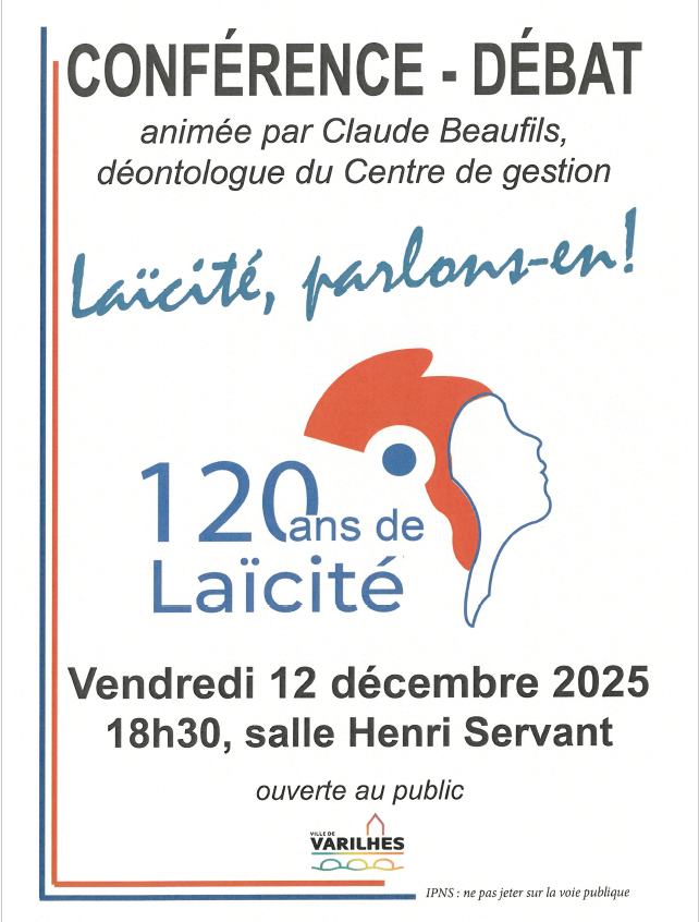 Dans le cadre de la commémoration du 120ᵉ anniversaire de la loi du 9 décembre 1905 relative à la séparation des Églises et de l’État, une conférence animée par Monsieur Beaufils, déontologue du Centre de gestion, aura lieu le Vendredi 12 décembre à 18h30 à la Salle Henri Servant.