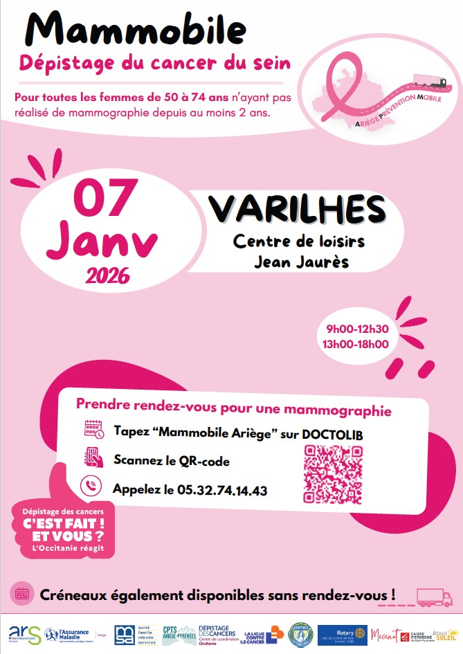 Le mercredi 7 Janvier, le centre de loisirs de Varilhes accueillera la Mammobile, un camion spécialement équipé pour réaliser des mammographies. Ce service de dépistage itinérant, mis en place pour faciliter l'accès aux soins, s'adresse aux femmes âgées de 50 à 74 ans, qui sont invitées à profiter de cette opportunité pour effectuer un examen de dépistage du cancer du sein.