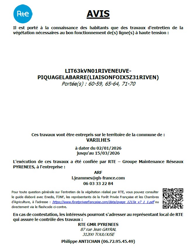 Des travaux d'entretien de la végétation nécessaires au bon fonctionnement de(s) ligne(s) à haute tension seront entrepris sur la commune de Varilhes du 02 janvier 2026 jusqu'au 15 mars 2026.